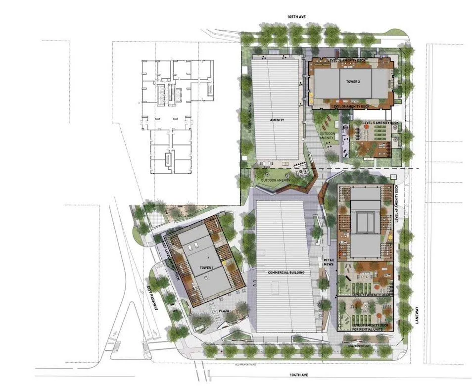 Located in the centre of the site, along a north-south mews connecting 104 Avenue to 105 Avenue, is a 2-storey amenity building at the north end and a 2.5-storey commercial lowrise at the south. A variety of community gathering spaces include a public plaza at the corner of City Parkway and 104 Avenue, a dog park on the north side of Tower 1, an amenity green at the centre of the site, and numerous landscaped sitting areas scattered throughout. The lively combination of the plaza, market hall, and restaurant lining 104 Avenue is intended to draw people into the site.
